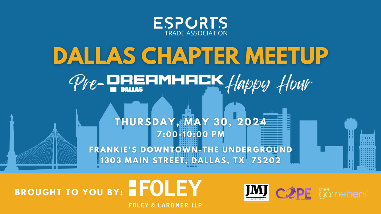 Attention Dallas Area Esports Industry Professionals!Let's meet before DreamHack Dallas, catch up, talk shop, and share about what the Esports Trade Association has in store for the coming year and the EsportsNext 2024 Conference!